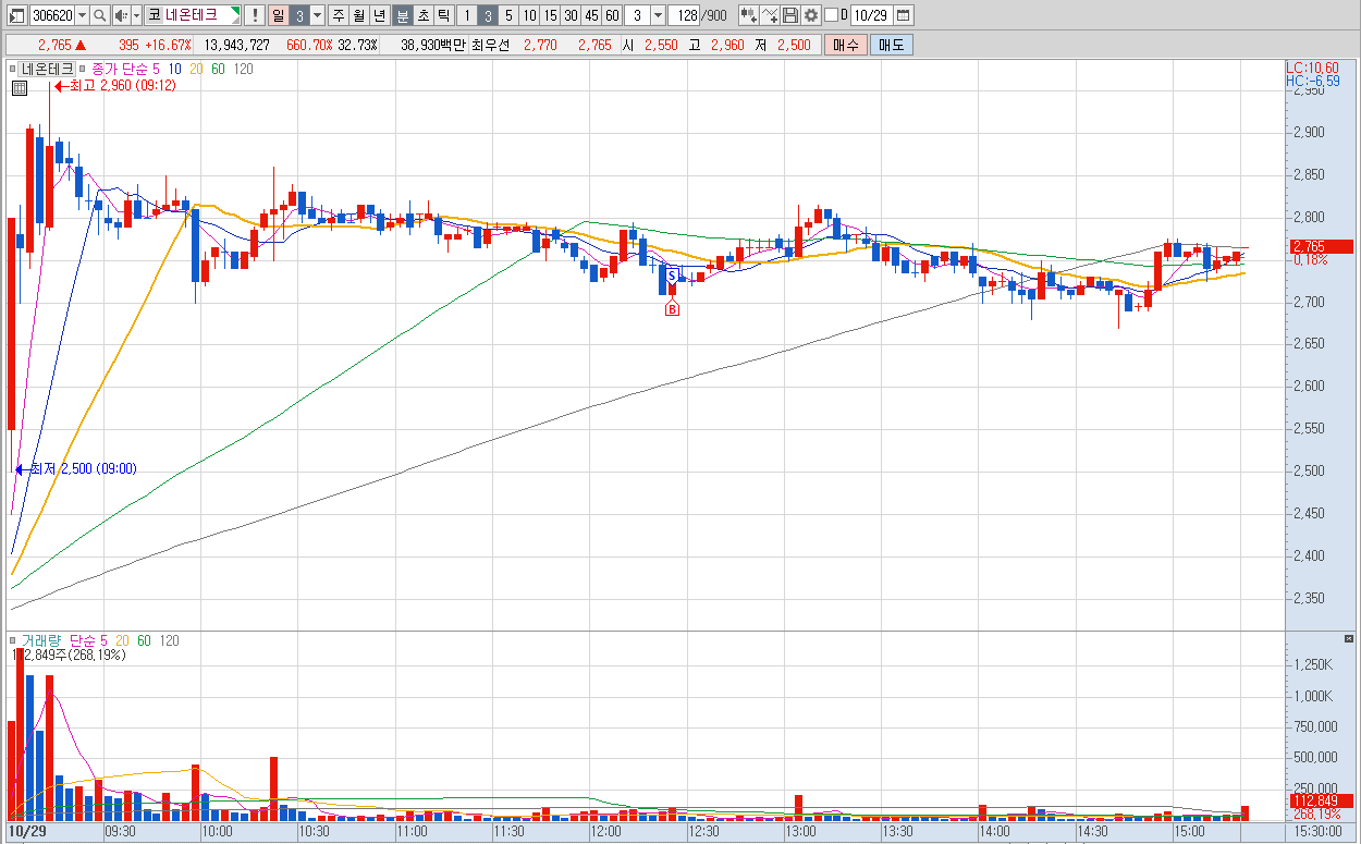 그렇다고 해서 데이 트레이딩으로 끌고 갈 것은 아니기 때문에 케이옥션과 같은 종목이 나오면 매도를 조금 더 버텨볼 수 있겠고, 네온테크의 경우, 1~2% 수익을 지켜보다가 매수세와 매도세의 흐름에 따라 판단해서 날리면 되겠음.