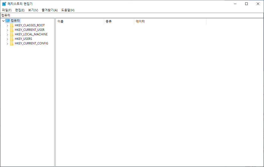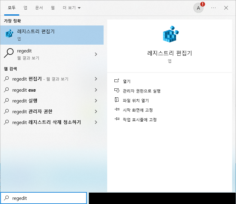 - 윈도우 키 + "regedit" 검색 : 레지스트리 편집기 클릭