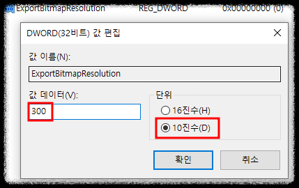 - 새로 생성된 레지스트리의 이름을 "ExportBitmapResolution"으로 입력한 뒤에 더블 클릭하면 팝업창이 뜹니다.