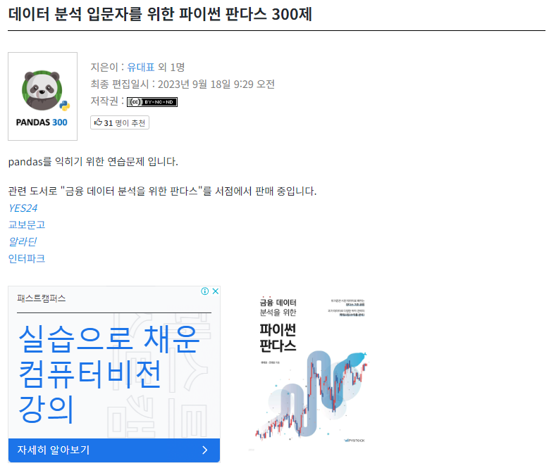 ▼ ▼ ▼판다스 300제 링크는 요기를 클릭해주세요 ▼ ▼ ▼