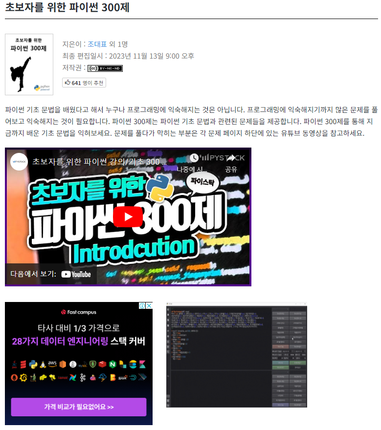 그런데 오랜만에 실습예제 url을 올려둔 포스팅을 발견하게 되어 파이썬을 이제 막 공부하시려는 분들을 위해 링크 공유드립니다.