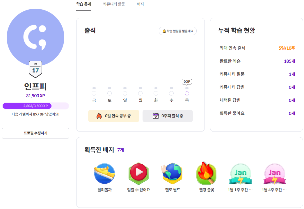 영상 1개, 예제 1개를 힌트 없이 풀 때마다 경험치가 쌓여서 레벨 업이 되는데 캐릭터가 아닌 제가 진짜 레벨업하는 느낌이라 기분도 좋고 성취감도 있었어요.