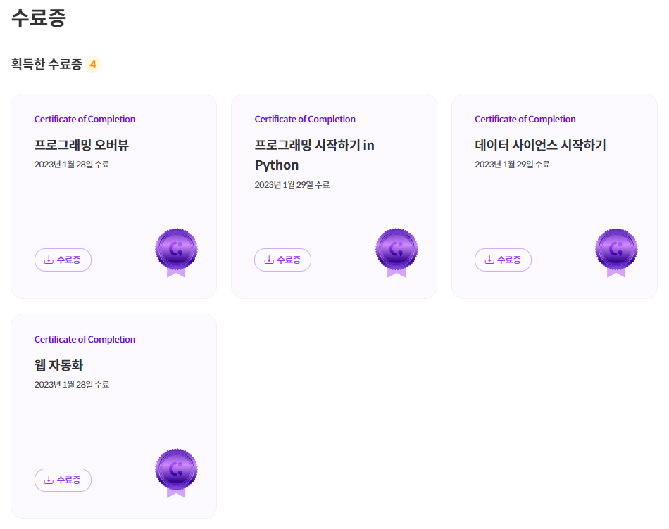 이미 알고 있는 내용들, 아직 풀지 못한 과제들이 있어서 수료증이 레벨이나 수강한 강의(241개)에 비해 수료증은 많지 않네요 ^^::