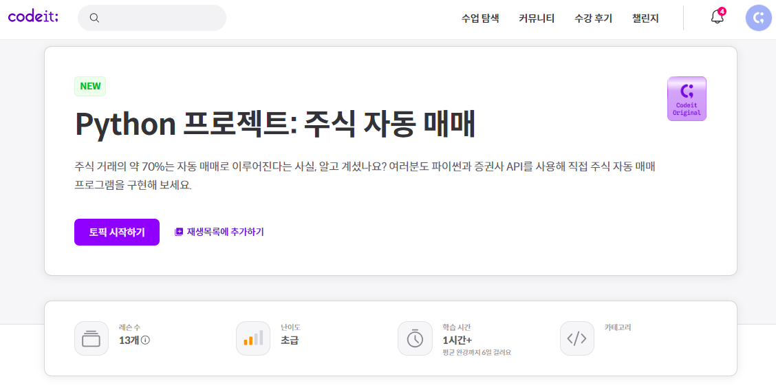 지금 공부해야 할 것들이 산더미이지만 가장 흥미가 가는 것은 역시 "주식 자동 매매"입니다. 유튜브에도 여러 영상들이 있어서 한 번 해보려 했었는데 신규 커리큘럼이 생겨서 한 번 도전해보려 합니다 :)